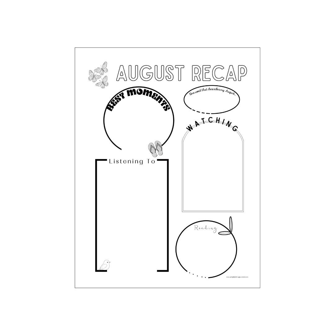 A summery recap page for August for your bullet journal. Use your buju to journal about August’s best moments, the one word that describes your August, and what you were watching, reading, and listening to this August. Check out the other bujo free journaling printables!